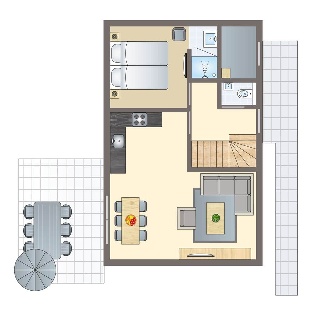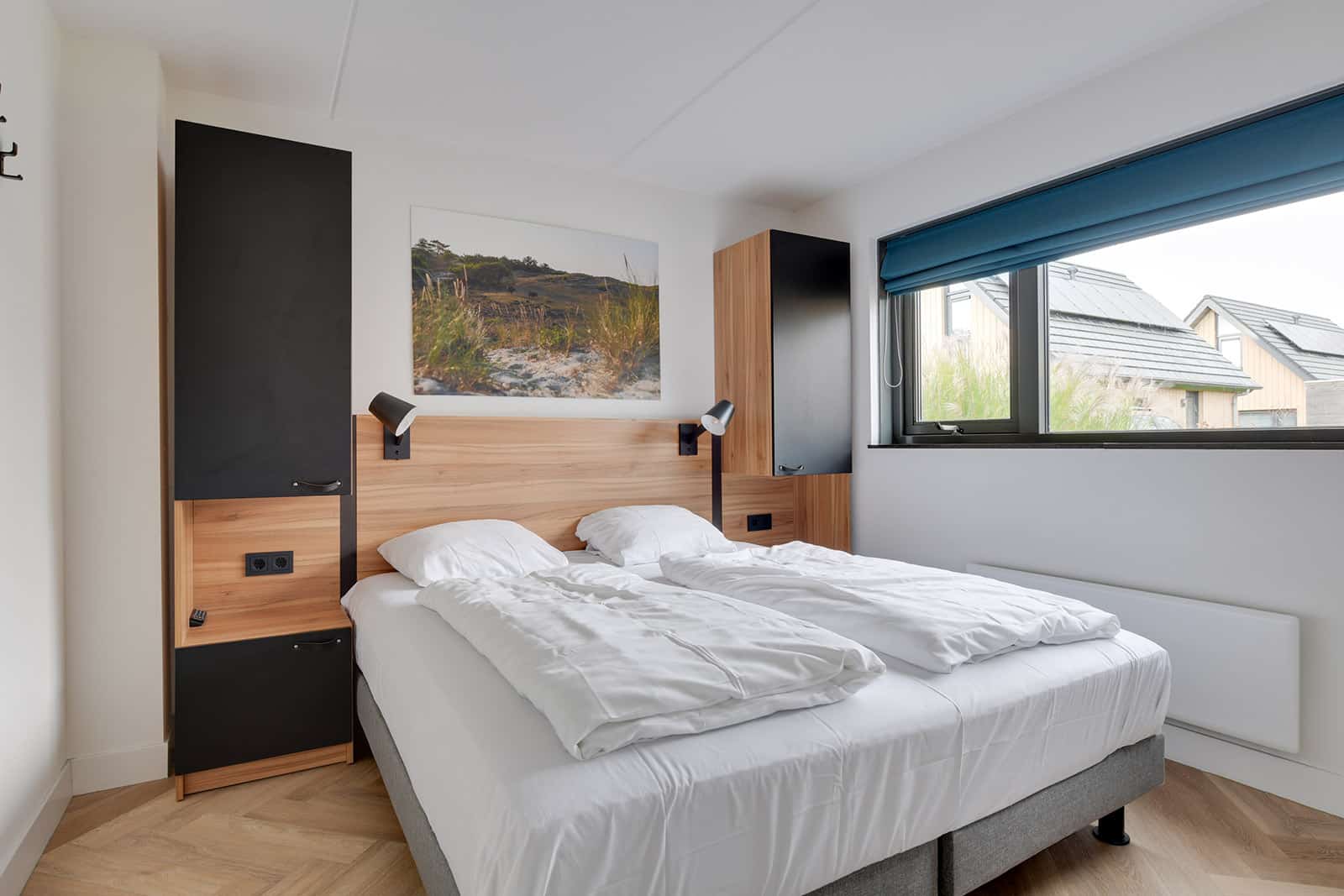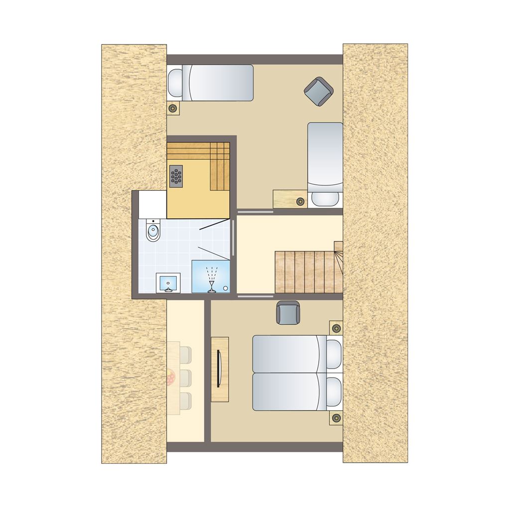 De 6 persoons Luxe woning heeft drie ruime slaapkamers. Eén slaapkamer bevindt zich op de begane grond, met inloopdouche en wastafel. Via de trap in de hal bereikt u de verdieping. Op de verdieping zijn de twee overige slaapkamers, beide met frans balkon. De badkamer op de verdieping is voorzien van een sunshower en een ruime sauna met luxe uitstraling.