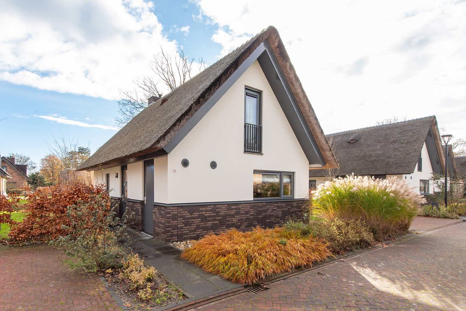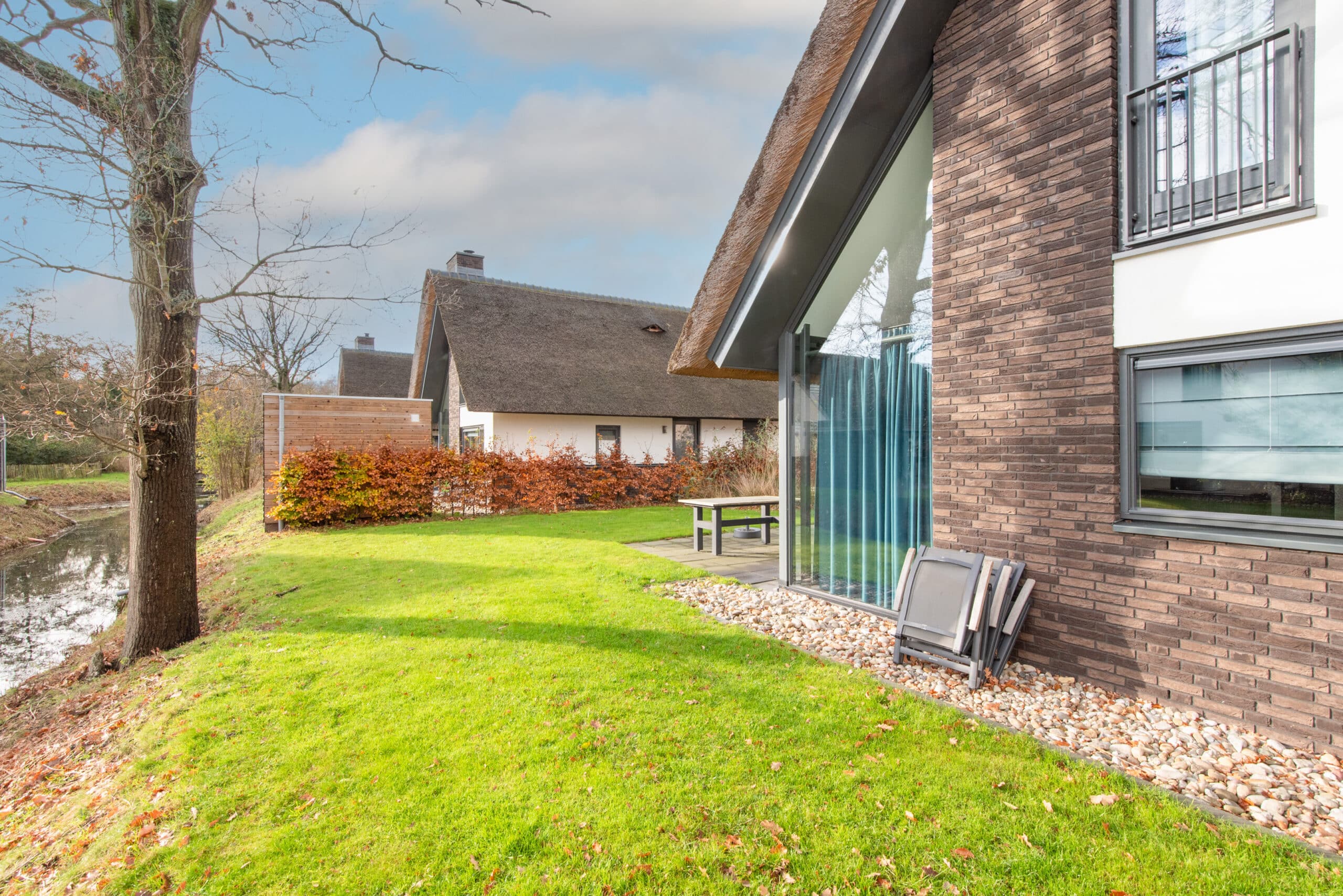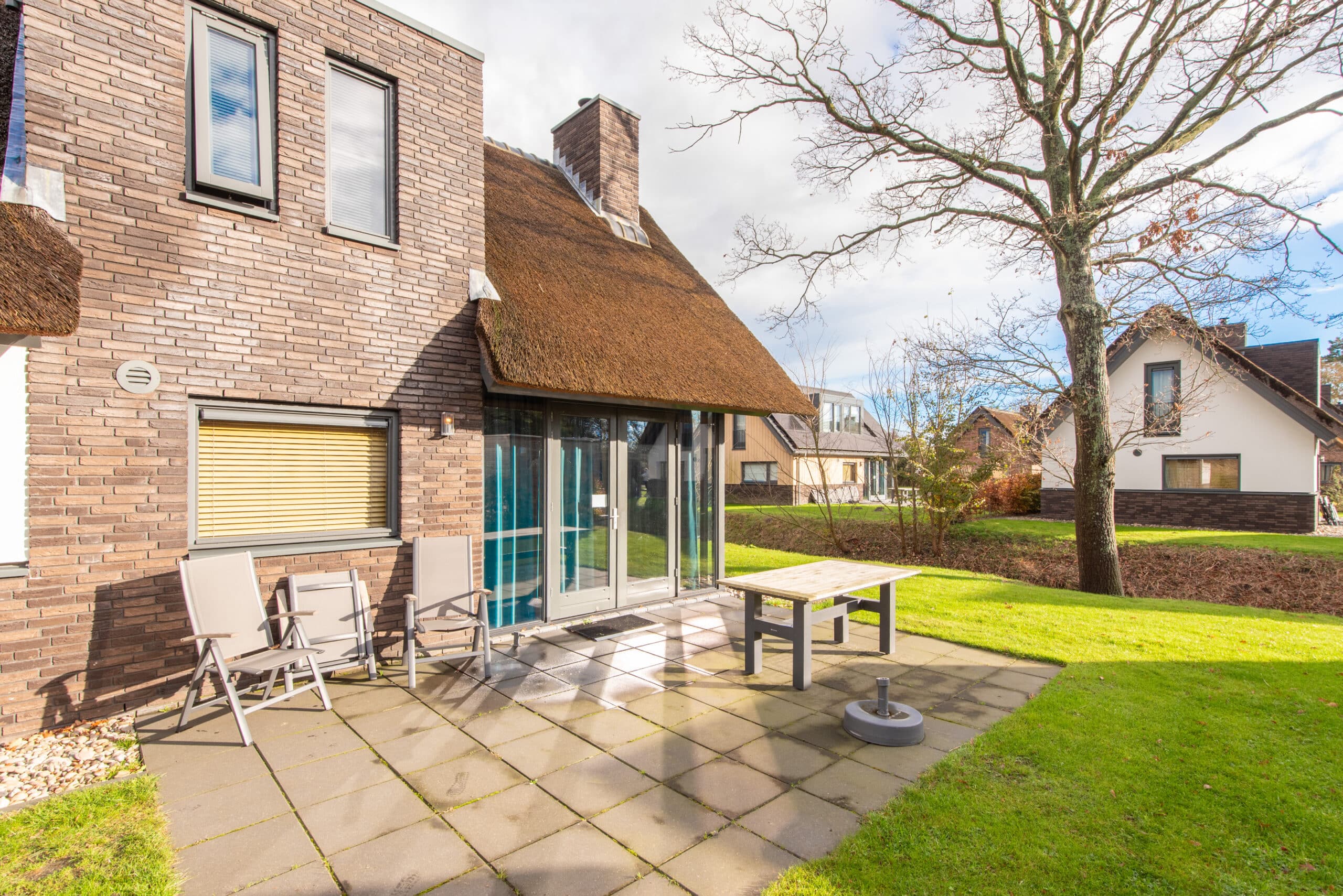 Deze luxe 6 persoons woning is opgetrokken uit fraai metselwerk en heeft door bedekking met riet een natuurlijke uitstraling.