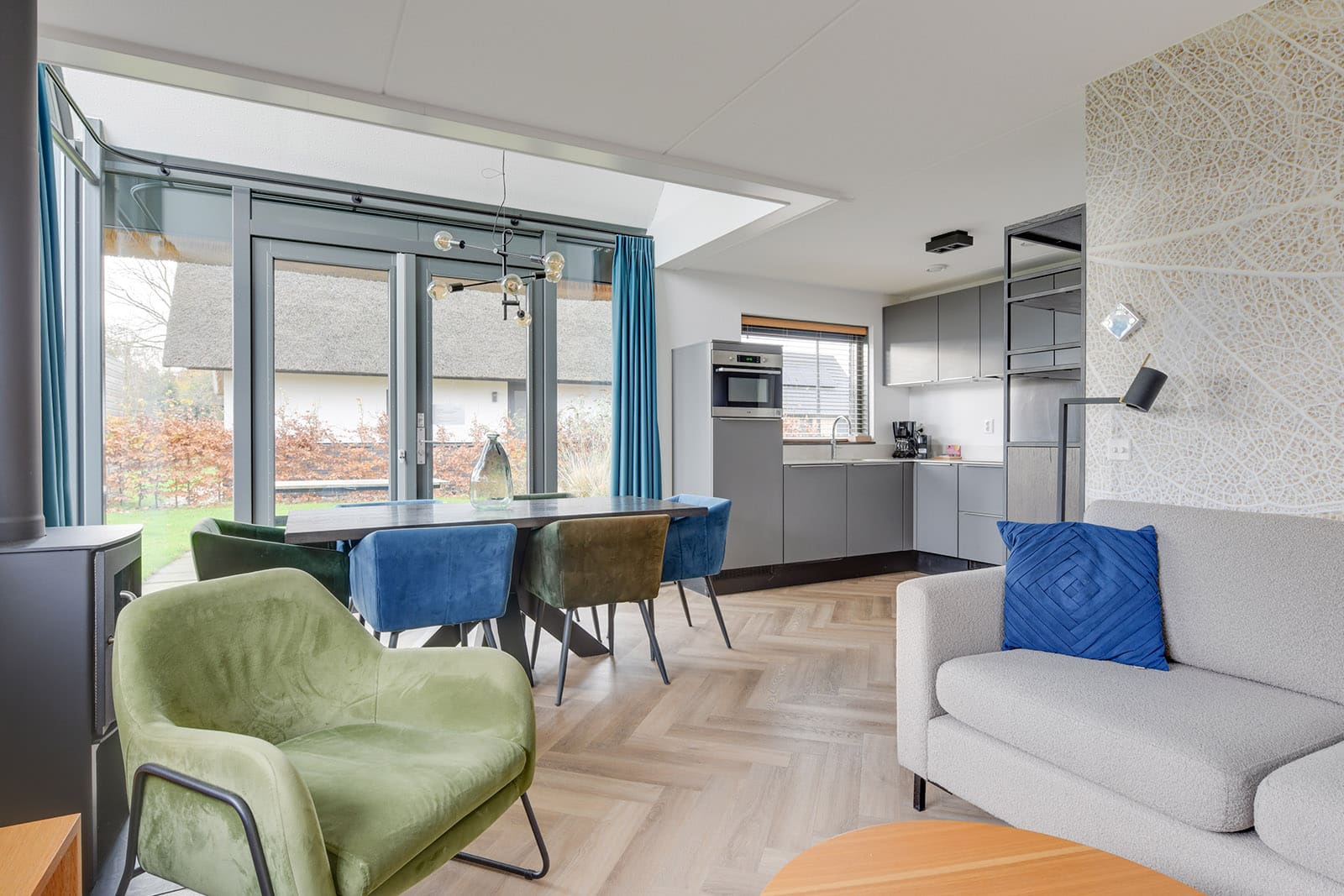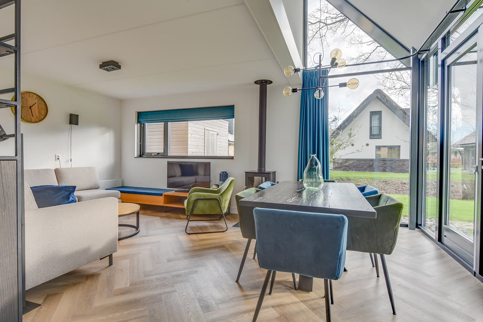 • Glazen hoekpui met terrasdeuren, Houtkachel en Smart-TV